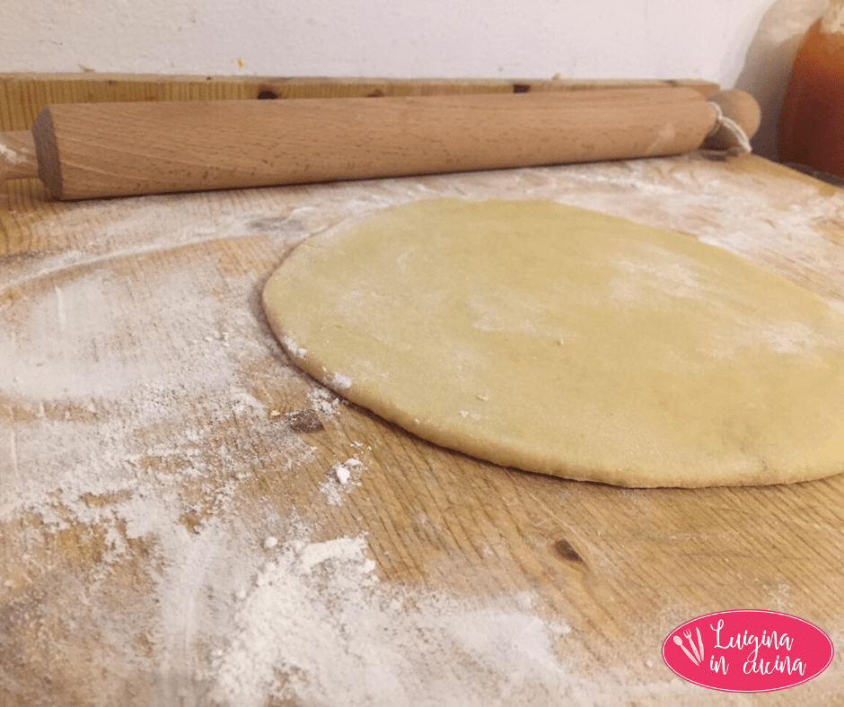 Segnate la circonferenza della tortiera sull’impasto in modo da avere un cerchio preciso e adagiate l’impasto all’interno , pressandolo con le dita e delineando i bordi.