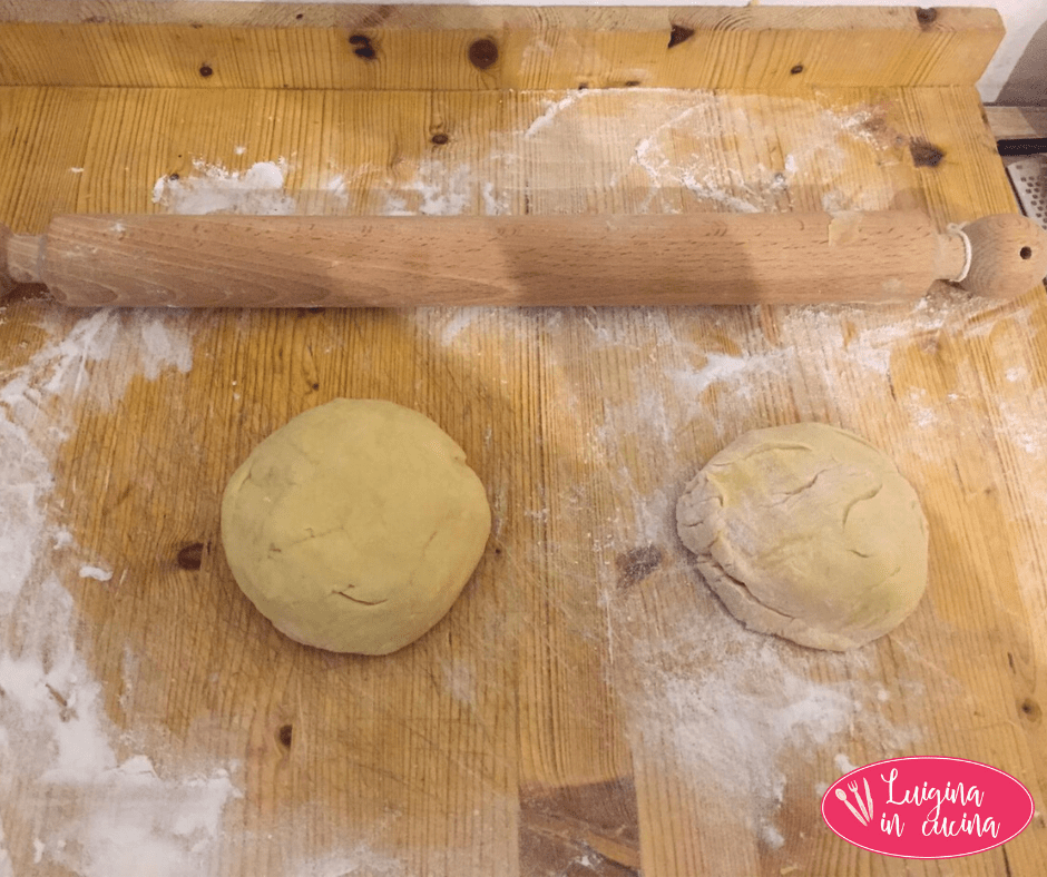 Dividi l’impasto ottenuto in due panetti: uno leggermente più grande per la base e l’altro per le strisce di copertura.
