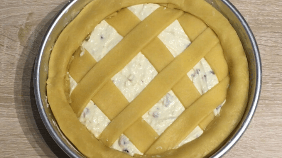 - Versa la crema di ricotta e gocce di cioccolato nella crostata e decora con le strisce di pasta frolla