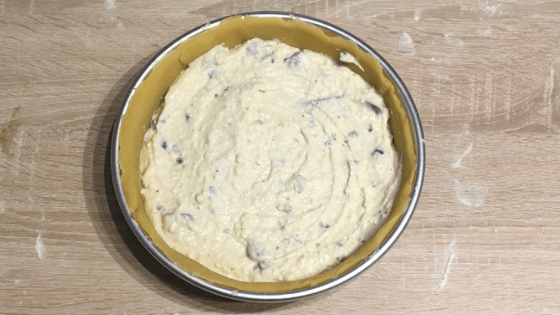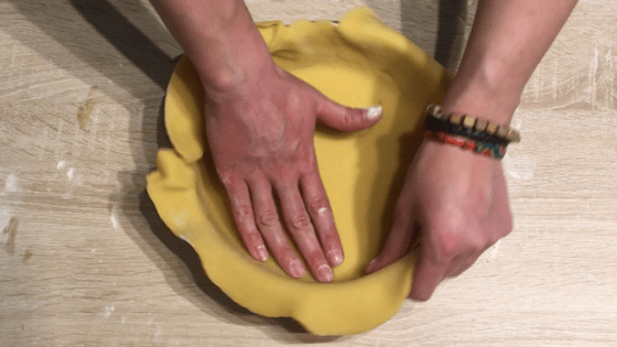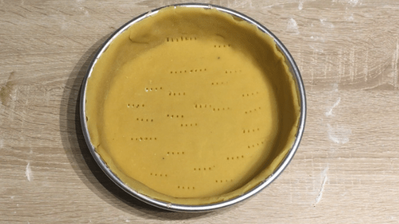 - Dividila in 2 parti e utilizza la parte più grande per rivestire uno stampo per dolci del diametro di 22 cm (puoi utilizzare anche uno stampo più grande, la torta risulterà più sottile)